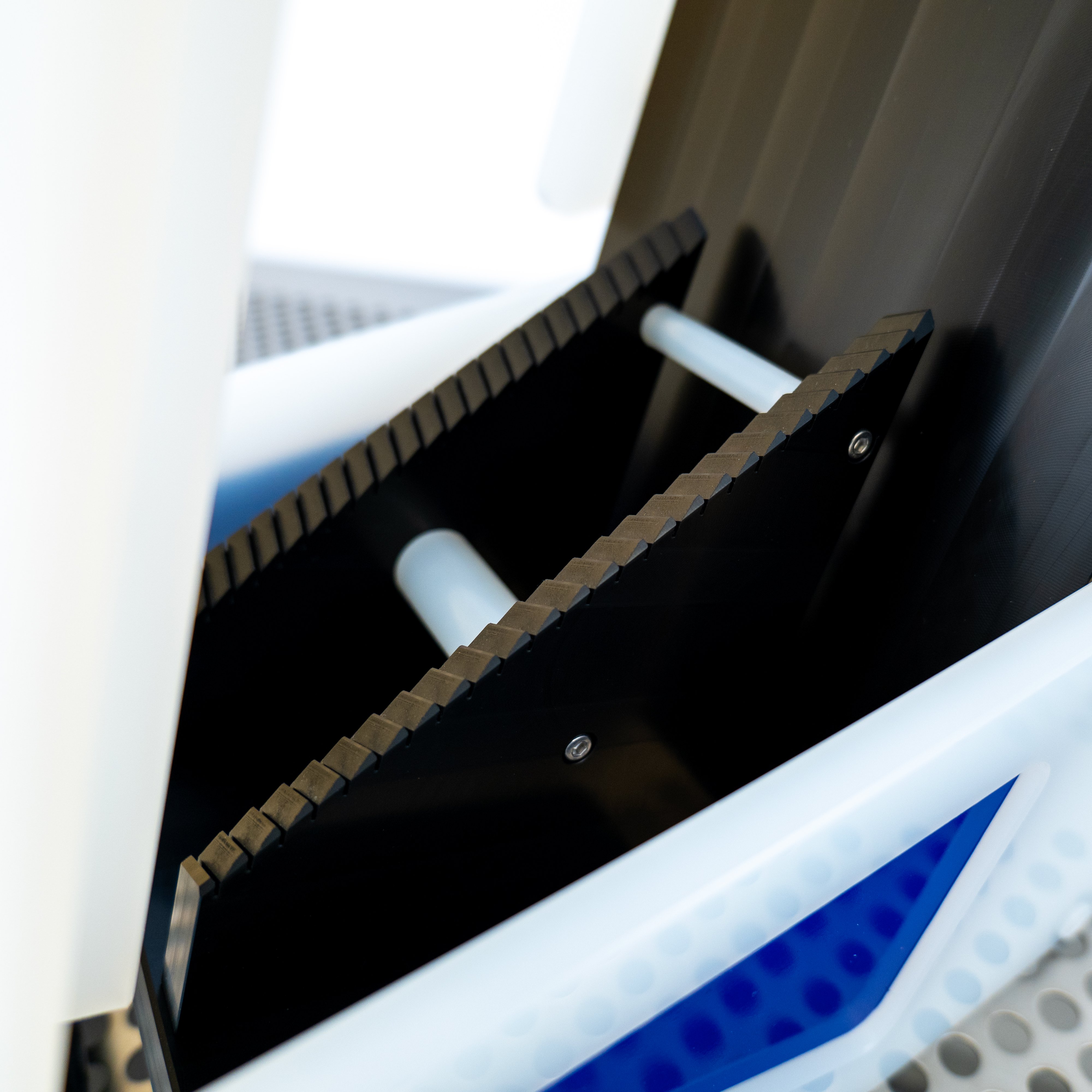 Operators use the WHS-P2 by lowering a wafer cassette with wafers onto the tool. The ergonomic angle and built-in guides make this process easy and repeatable, ensuring precise positioning every time. The unique comb design provides protection against wafer edge chipping, further enhancing wafer safety. The escalator raises each wafer 0.200" (5mm) above the previous one, allowing operators to quickly and efficiently verify the entire wafer lot.