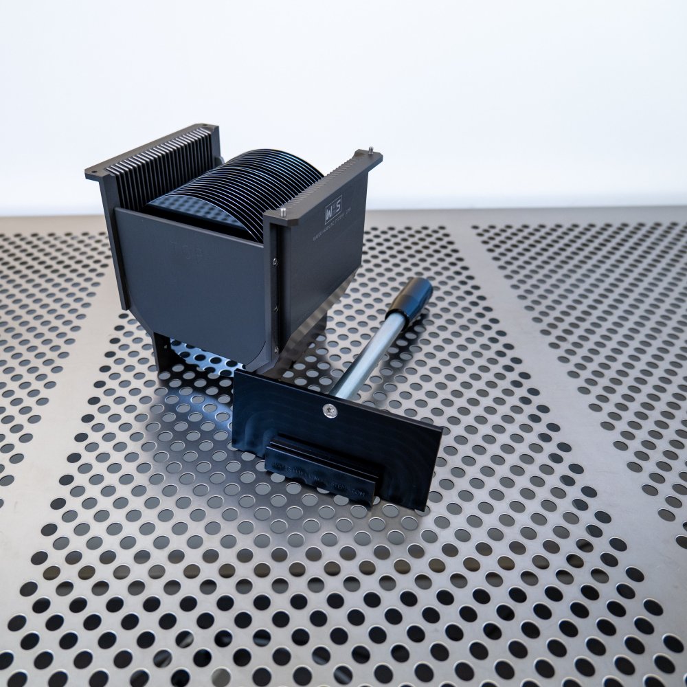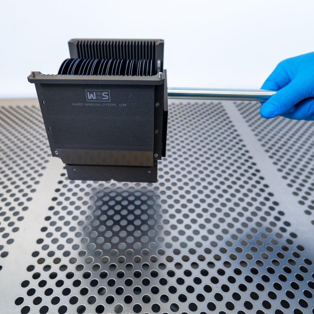WHS - Wafer Handling Systems has developed an advanced detachable cassette handle specifically for the 6 inch WHS-M1 style aluminum cassettes with H-bar, enhancing operator safety and efficiency in high-temperature environments like ovens and process chambers. Designed for use on operator workstations or cool down acclimation work surfaces immediately post-bake, this handle can safely manage hot cassettes in a wafer vertical position. This handle features ergonomic plastic pistol grips, providing a convenient and secure method for handling aluminum process cassettes. The stainless-steel plate includes an interface channel, ensuring a secure connection with the cassette to prevent accidental drops. Constructed from advanced cleanroom materials, engineered to withstand thermal heat and minimize particle shedding.
